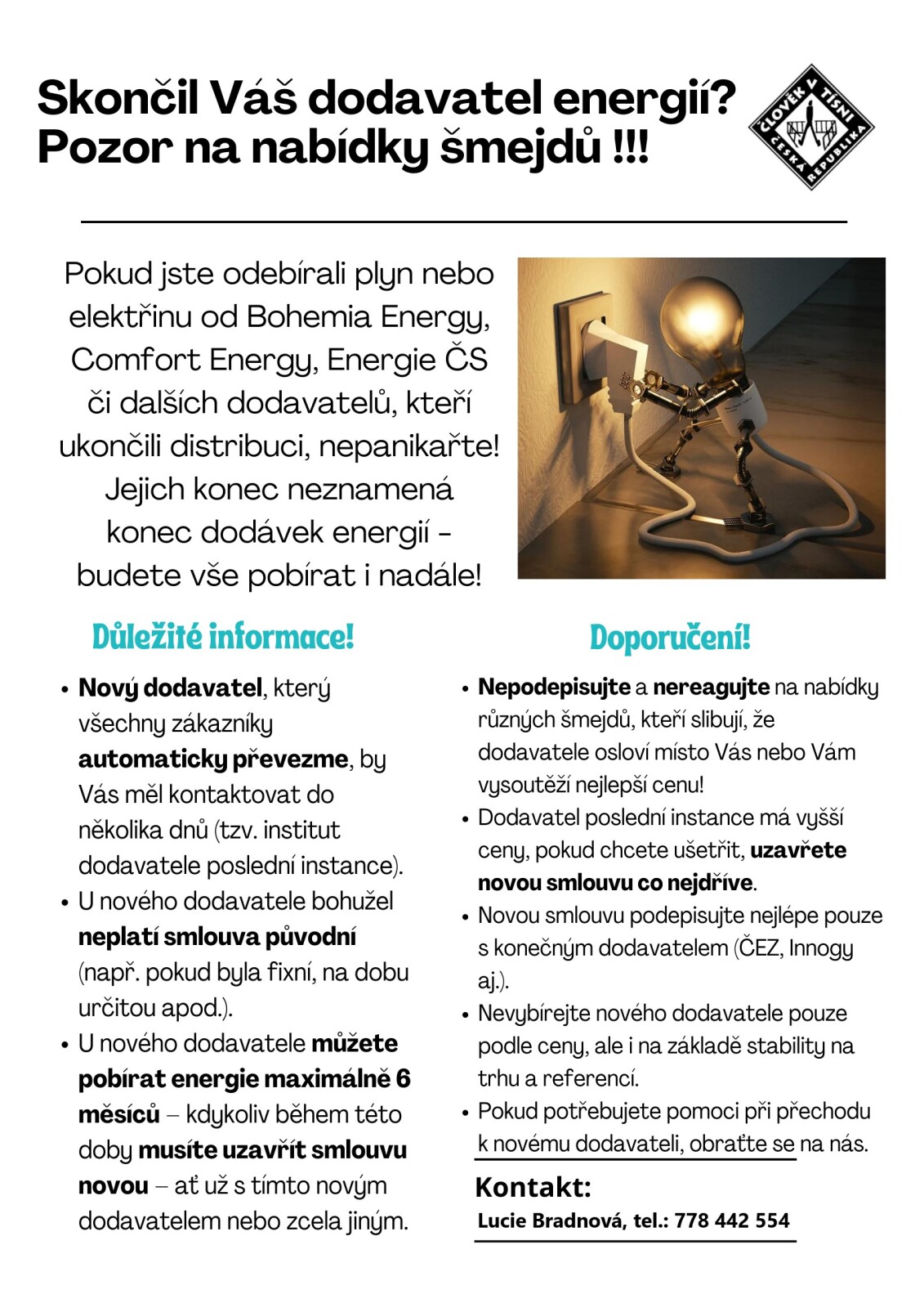 Úvod > Život v obci > Aktuality > Člověk v tísni - informace - změna dodavatele energií