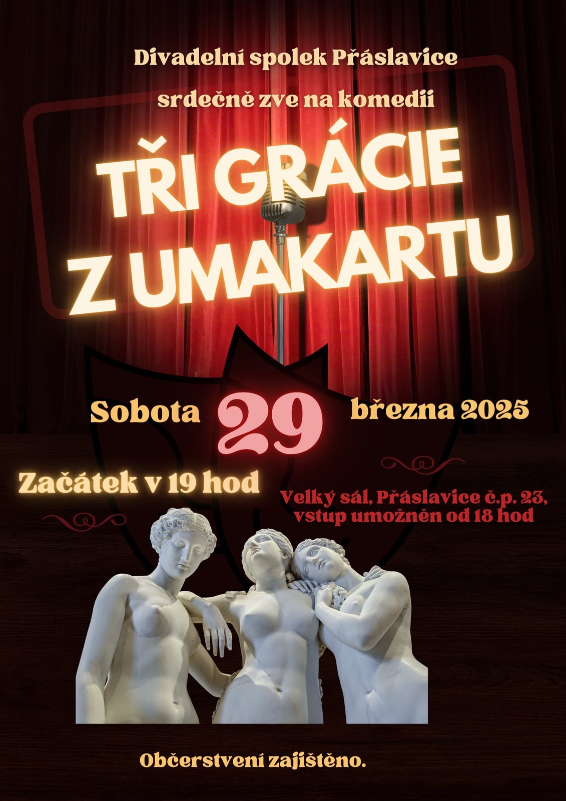 Divadelní spolek Přáslavice zve na komedii Tři Grácie z umakartu. Už tuto sobotu na Velkém sále OÚ.