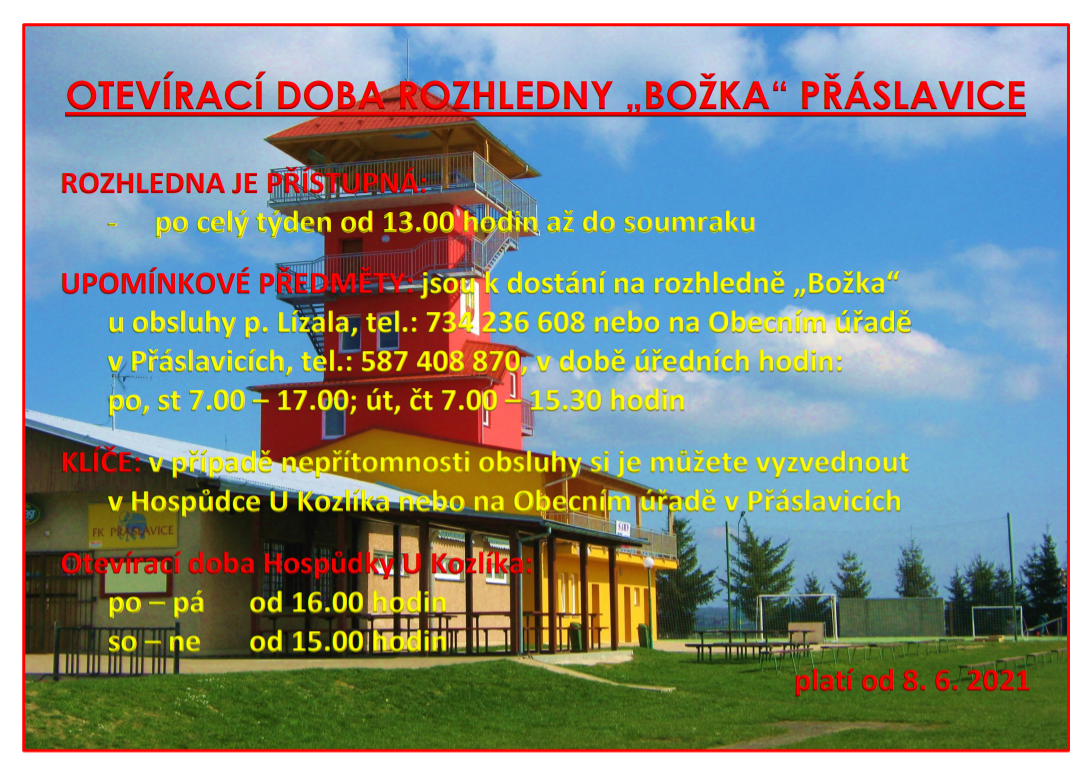 Informace - otevírací doba Rozhledny Božka Přáslavice od 8.6.2021