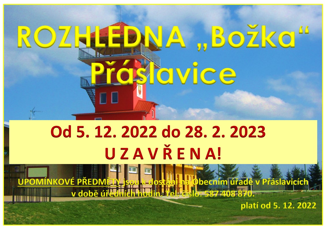 Úvod > Život v obci > Aktuality > Informace - Rozhledna Božka Přáslavice od 5.12.2022 do 28.2.2023 uzavřena