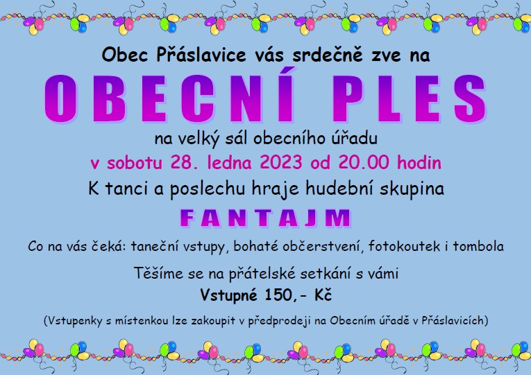 Úvod > Život v obci > Aktuality > Pozvánka na Obecní ples - Přáslavice 28.1.2023