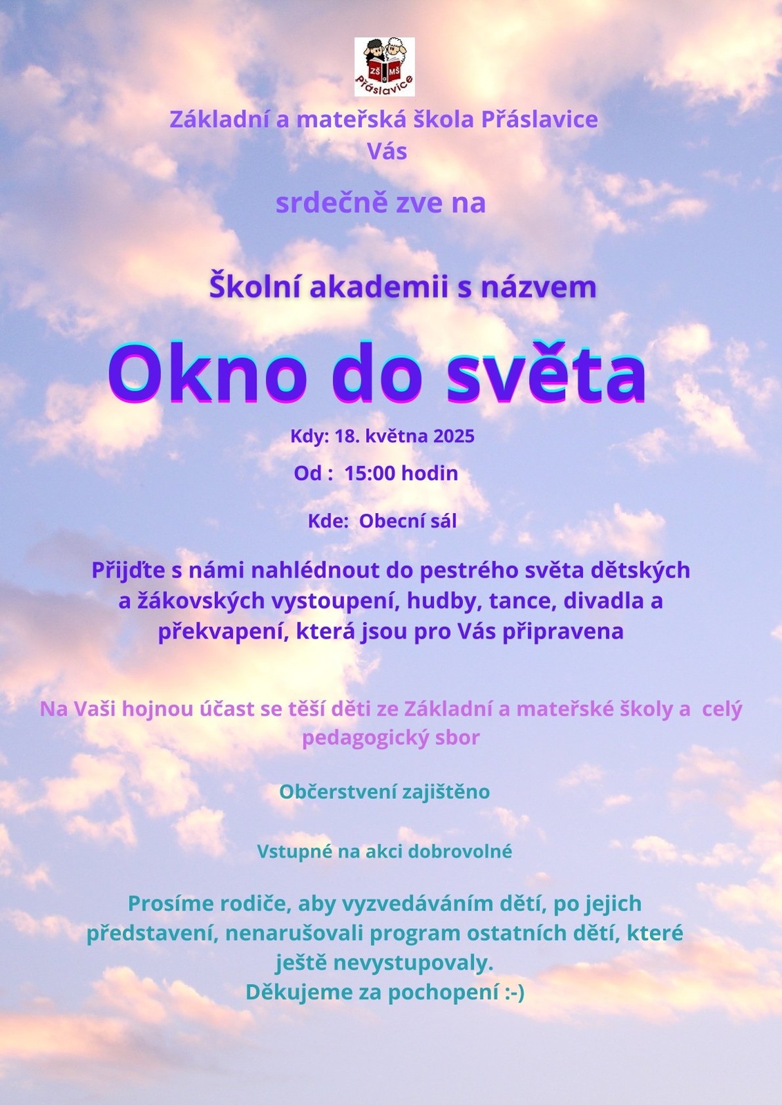 Úvod > Život v obci > Aktuality > Pozvánky ze ZŠ a MŠ Přáslavice na květnové akce
