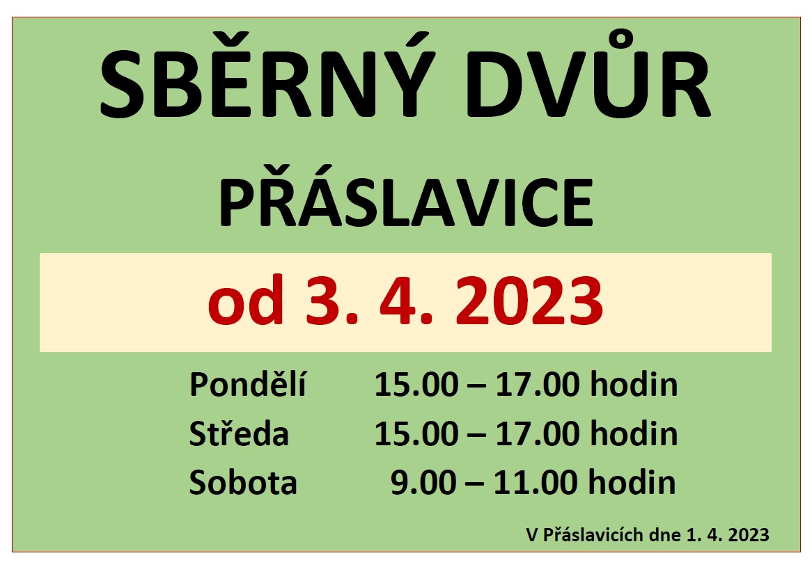 Úvod > Život v obci > Aktuality > Změna provozní doby Sběrného dvora Přáslavice od 3.4.2023