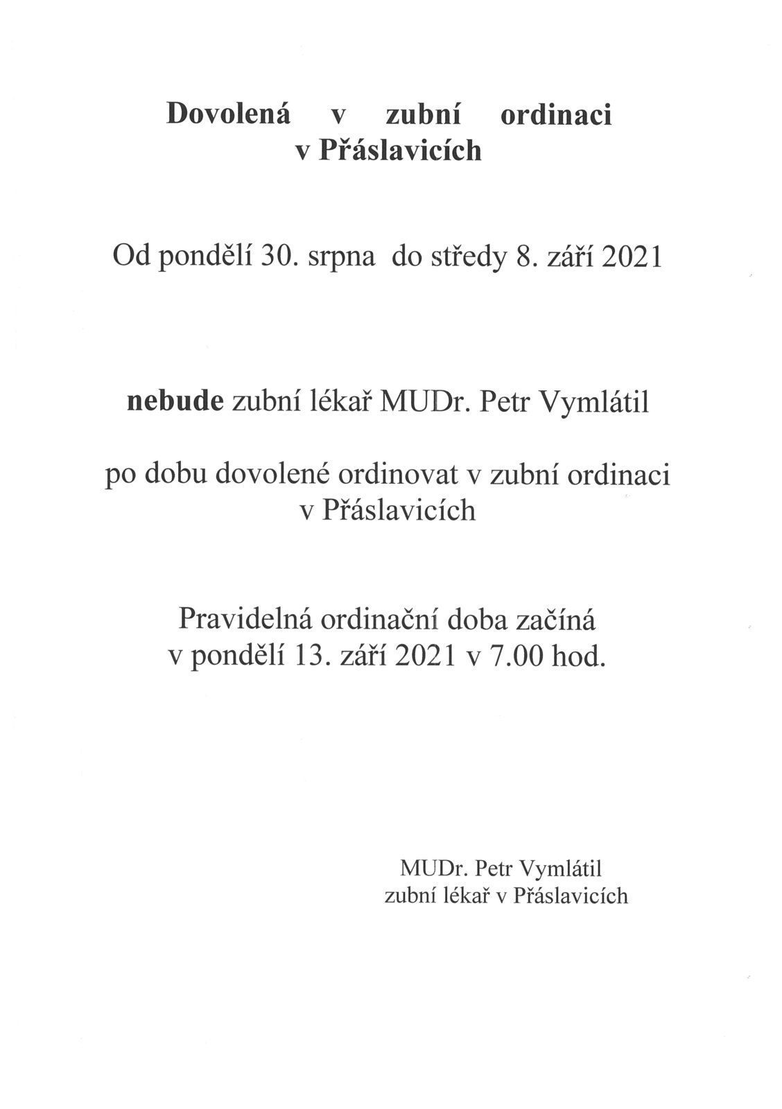 Úvod > Život v obci > Aktuality > Zubní ordinace MUDr. Vymlátil - dovolená