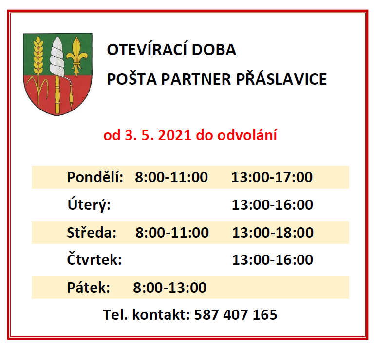 - POŠTA PARTNER Přáslavice od 2. 3. do ODVOLÁNÍ: