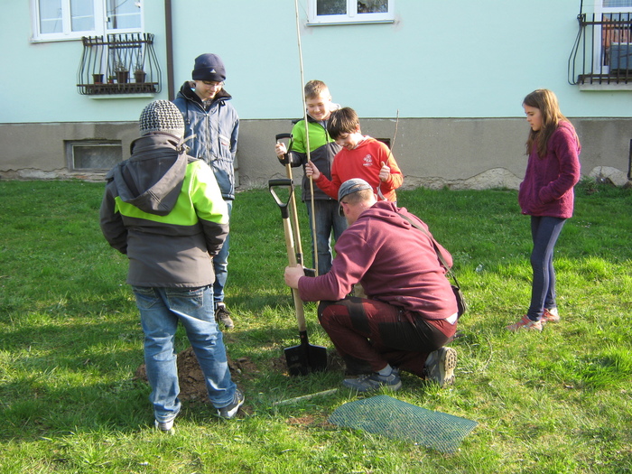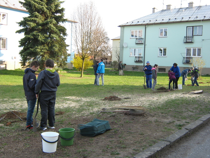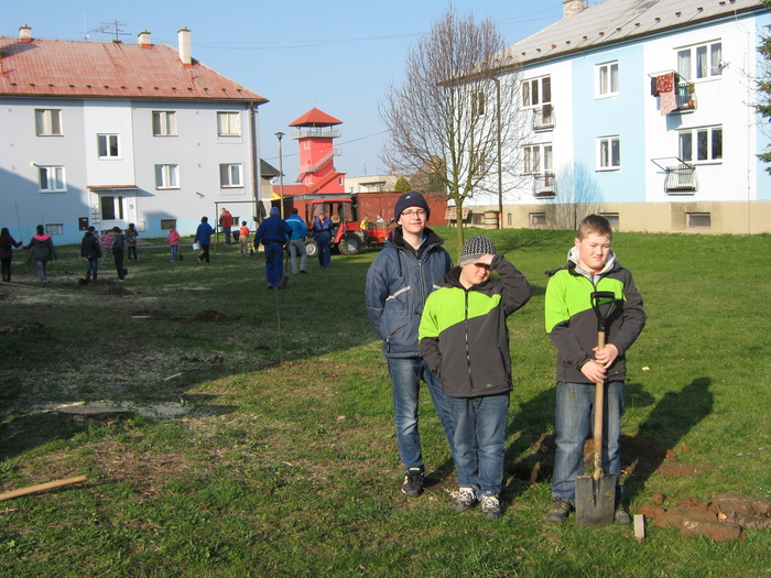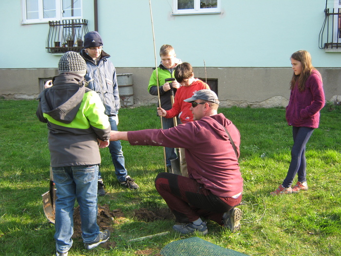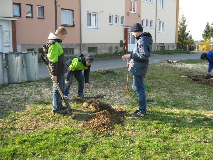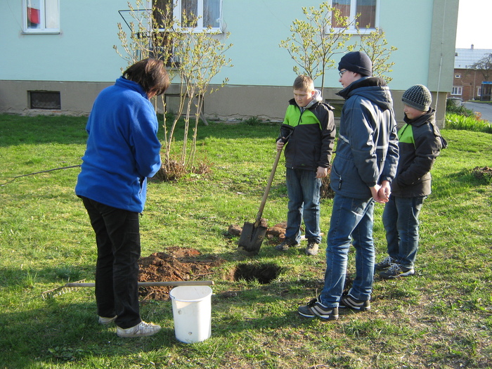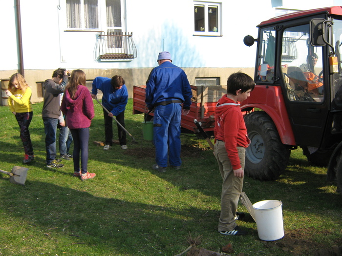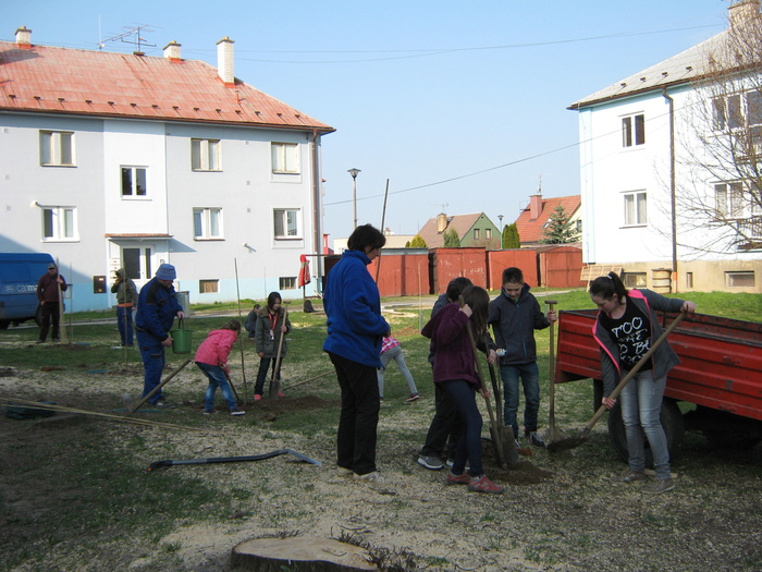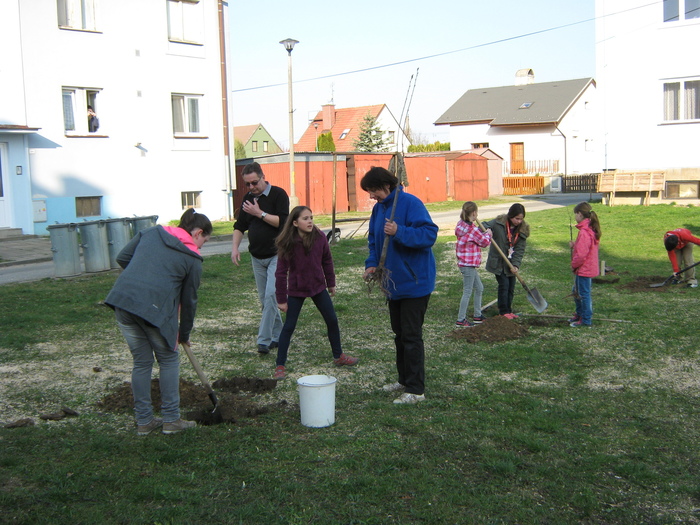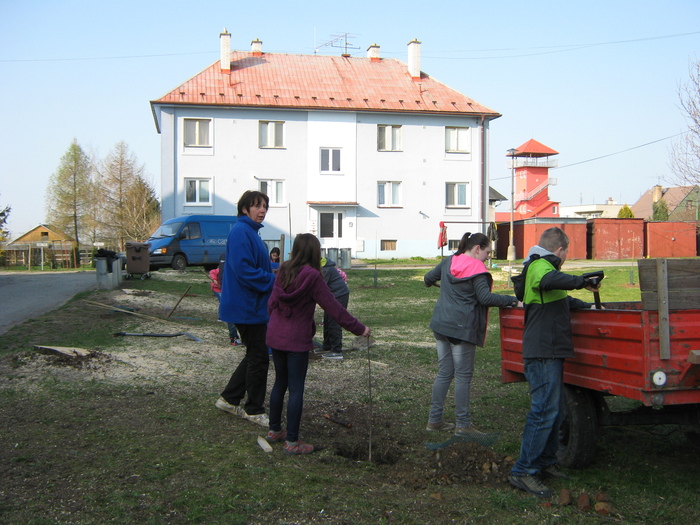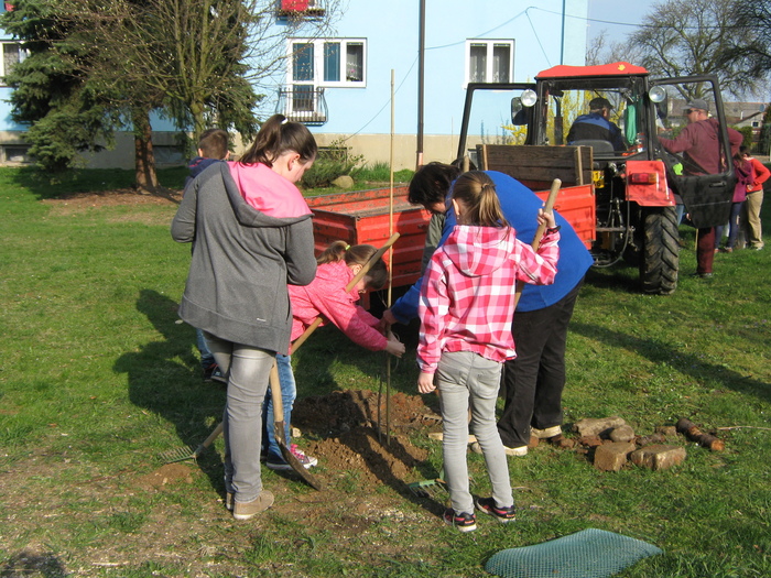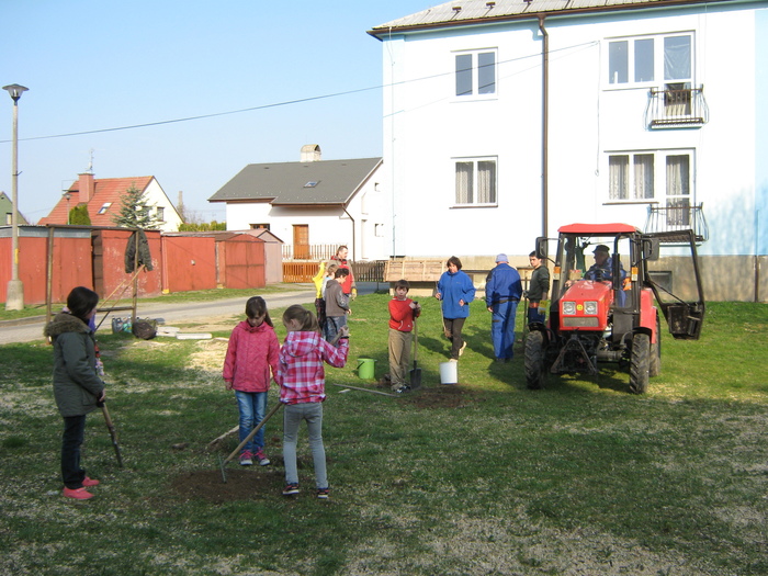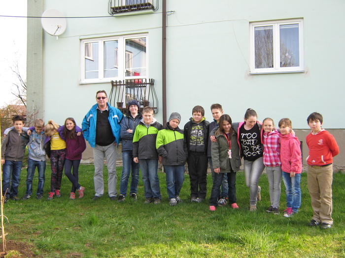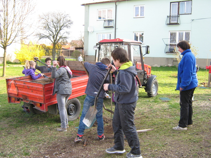 Úvod > Život v obci > Fotogalerie z akcí > Výsadba stromků OÚ a ZŠ Přáslavice - 15.4.2015